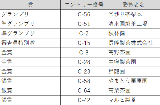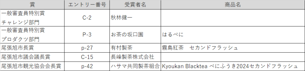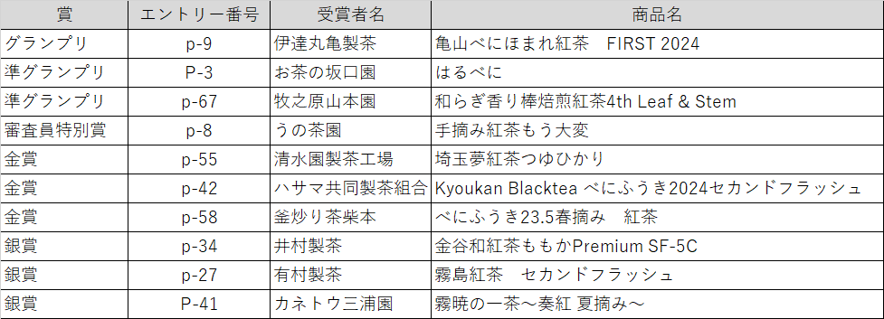 速報【国産紅茶グランプリ2024本選】結果発表(追記) 2024.11.01 【国産紅茶グランプリ2024本選】結果発表 各賞の受賞者は下記のとおりです。 受賞された皆様おめでとうございます。 チャレンジ部門 プロダクツ部門 特別賞 講評は後日公開いたします。 ※各賞を受賞された入賞者のもとへ賞状を郵送でお送りさせていただきます。また両部門のグランプリ、準グランプリを受賞された入賞者には併せて副賞もお送りさせていただきます。
